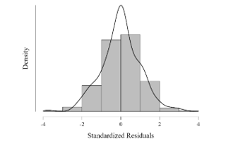 Bedasarkan hasil uji normalitas yang telah dilakukan dengan menggunakan metode grafik, maka ditemukan data penelitian memiliki titik residual tertinggi berada di titik 0, sehingga titik puncak dari grafik garis yang terbentuk juga berada di titik 0. Data kedua berupa uji data analitik (p = 0.126) yang memenuhi syarat data terdistribusi normal yaitu (p-value > 0,05). Sehingga data tersebut mendukung terpenuhinya normalitas data. Sehingga dapat dikatakan apabila data terdistribusi secara normal.