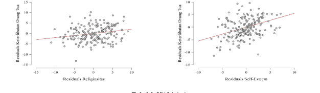 Selanjutnya, uji linearitas yang juga menggunakan metode grafik menunjukkan bahwa residual data penelitian dari religiusitas dengan keterlibatan orang tua dan self-esteem dengan keterlibatan orang tua berkumpul mendekati garis linear yang condong keatas. Selain itu, titik-titik residual yang berkumpul jika ditarik garis akan membentuk bentuk oval yang menandakan linearitas antara variabel. Selanjutnya uji statistik linearitas juga menunjukkan bahwa uji linearitas untuk variabel keterlibatan orang tua dengan religiusitas (p = 0.63) dan keterlibatan orang tua dengan self-esteem (p = 0,52). Kedua skor tersebut telah memenuhi standard asumsi linearitas yaitu nilai (p-value > 0.05). Sehingga bedasarkan hasil tersebut dapat ditentukan bahwa data penelitian memiliki hubungan linear dan uji asumsi linearitas telah terpenuhi.