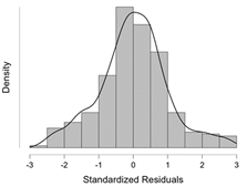 Hasil uji normalitas data menunjukkan hasil residual data berdistribusi normal. Hal ini dapat dilihat dari titik tertinggi diagram batang berada ditengah, dan data kurva yang berbentuk menyerupai lonceng. Dan nilai Shapiro-Wilk berada diatas 0,5. Maka berdasarkan data tersebut uji asumsi normalitas terpenuhi.