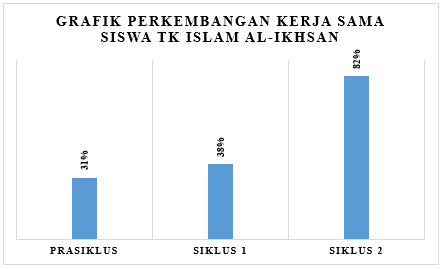 Pengamatan awal atau kegiatan pra siklus dilakukan terhadap 24 anak usia 5-6 Tahun di TK Islam Al-Ikhsan Lebo, dalam proses pengamatan awal ini menunjukan bahwa hanya 10 anak yang sudah memiliki kerjasama yang cukup optimal, sedangkan sebanyak 14 anak lainnya menunjukan kerjasama yang masih rendah. Menurut Trismahwati & Sari kerjasama merupakan suatu bagian dari bentuk perkembangan sosial-emosional anak yang harus distimulasi sejak dini dengan harapan anak akan mudah untuk membentuk relasi sosial yang sehat di lingkungan mereka . Kemampuan kerjasama anak di TK Islam Al-Ikhsan yang rendah ditunjukan dari perilaku beberapa siswa yang suka menyendiri dan masih malu-malu untuk meminta bantuan teman sebayanya, belum leluasa untuk bergabung dalam kelompok, dan minimnya keinginan untuk saling membantu temannya saat menyelesaikan tugas bersama. Masalah utama dari perilaku anak-anak tersebut diidentifikasi karena adanya rasa kurangnya rasa percaya diri, mengalami ketergantungan terhadap beberapa teman tertentu dan kurangnya pengalaman dalam aktivitas kolaboratif.